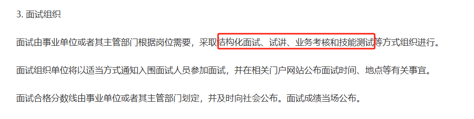 同时公告原文明确告诉我们事业单位面试形式可能会采取结构化面试、试讲,业务考核和技能测试等方式组织进行。