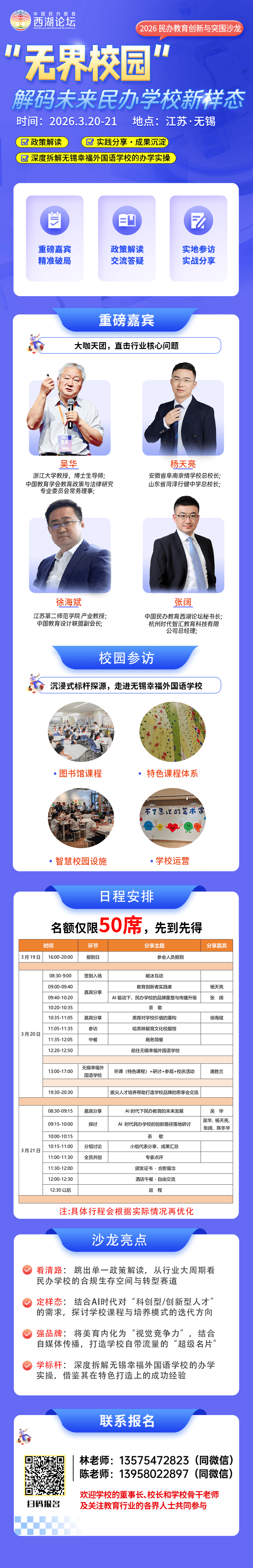 如果您希望进一步了解吴华教授对“十五五”政策导向、AI时代教育变革、无界校园构建与民办教育品牌塑造的系统解读,那么请一定关注中国民办教育西湖论坛组委会将于2026年3月20-21日,发起的主题沙龙——“无界校园,解码未来民办学校新样态”。