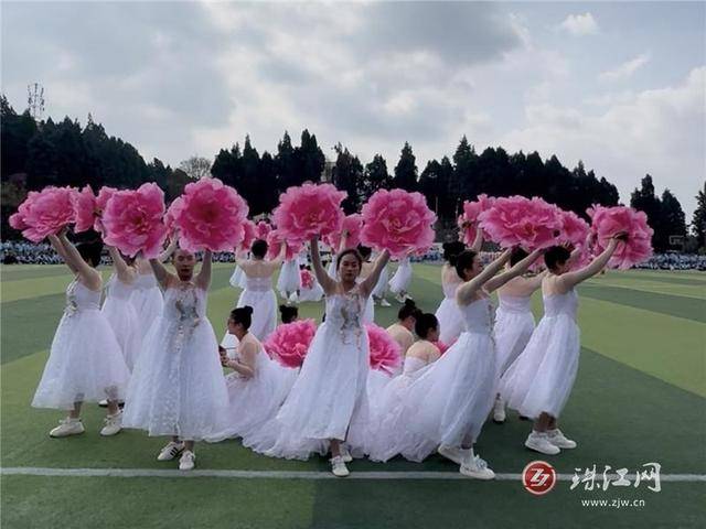伴随着欢快灵动的旋律响起,开幕式的核心环节——师生共舞,隆重上演。老师们放下讲台的严谨,同学们褪去课堂的羞涩,手拉手、肩并肩,在阳光下翩翩起舞。高二年级《天佑中华》、高一年级《舞动青春》、教师《水月亮》、七年级《彩蝶翩翩》、八年级《民族健身操:活力四射》将现场氛围推向高潮。