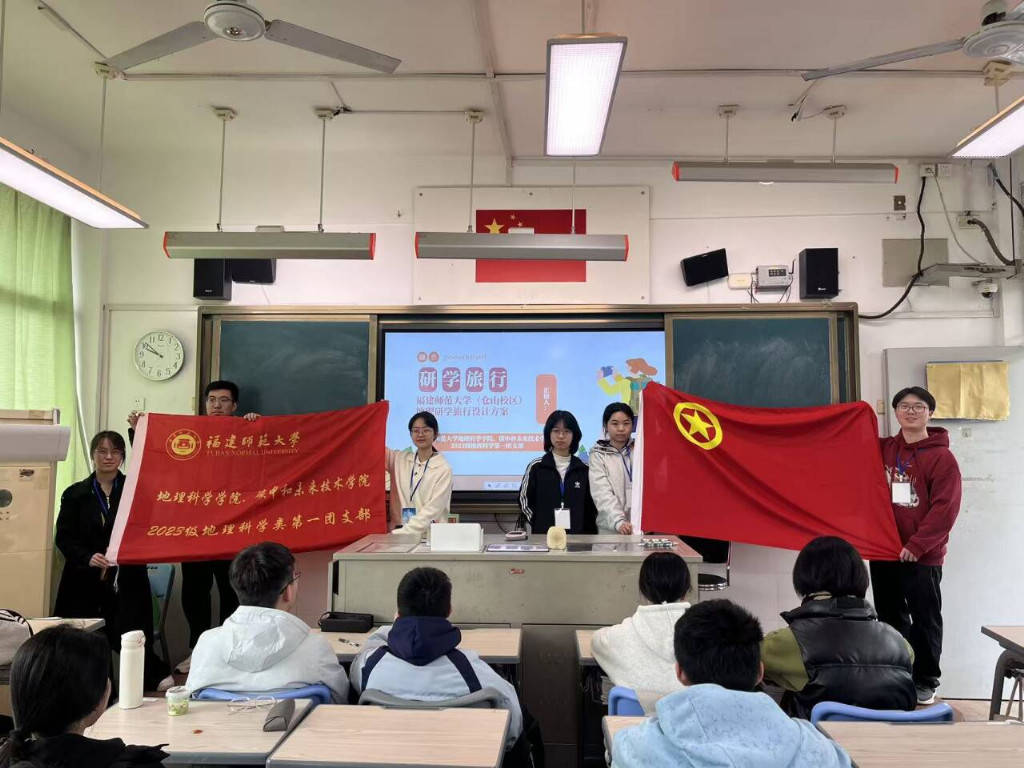 在问卷调研的基础上,支部成员走进教室,面向中学生开展了一场以“福建师范大学地理研学旅行设计方案”为主题的宣讲活动。围绕研学旅行的全过程,成员们从“研学准备阶段”切入,详细介绍了研学的多个关键环节。宣讲过程中,成员们通过图片展示和实例分享,将高校地理研学的设计思路传递给在场学生,激发了中学生对地理实践活动的浓厚兴趣。这一环节不仅让支部成员得以检验自身课程设计的可操作性,也进一步拉近了高校专业资源与中学研学需求之间的距离,为后续优化研学方案提供了来自学生视角的宝贵反馈。