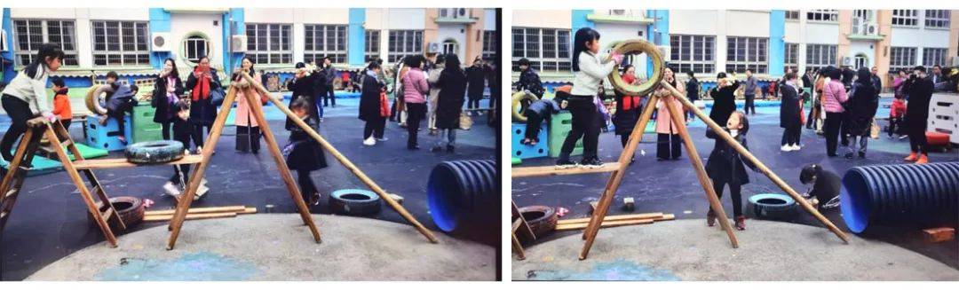 完成这个游戏,孩子们需要解决不少问题,如怎样将这样一个很重的轮胎举上去,并且保持身体的平衡?怎样搭出一个方便上下、站稳且高度合适、有利于将轮胎举到“轨道坡顶”的平台?选择多大直径的轮胎更容易钻进“隧道”?还可以添加些什么设施能够让这个游戏更好玩、更有挑战性?从游戏设计到实施的每一步都需要孩子们一起思考、探索、试验,也都蕴含着重要的深度学习机会。