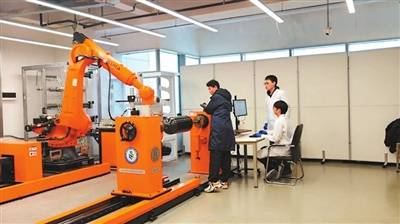 北京化工大学博士生在制备碳纤维复合材料高压储氢气瓶。