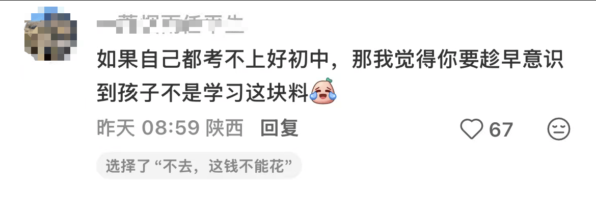 5. 更有网友直言,如果孩子连好一点的初中都考不上,说明本身就不是走纯文化课这条路的料,家长硬逼没用,10万很可能打水漂。