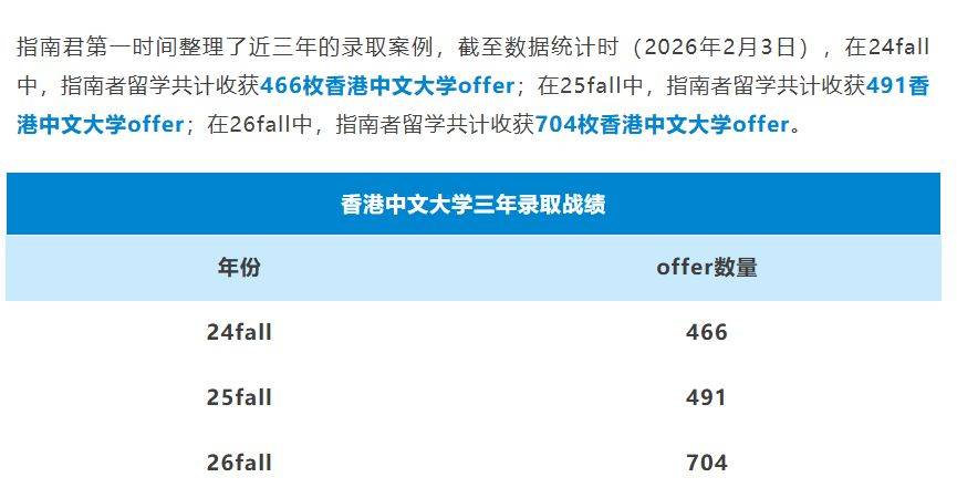 在留学申请竞争日趋激烈的当下,香港中文大学作为港校人文社科领域的标杆,其录取动态始终是无数申请者关注的焦点。近日,指南者留学公布了近三年港中文录取数据,一组惊人的增长数字引发热议:26fall 共计收获 704 枚 offer,较 24fall 的 466 枚暴涨 51%,这一数据是否意味着港中文扩招已成定局?结合录取背景、GPA 分布及院校最新政策,我们逐一拆解其中的关键信息。