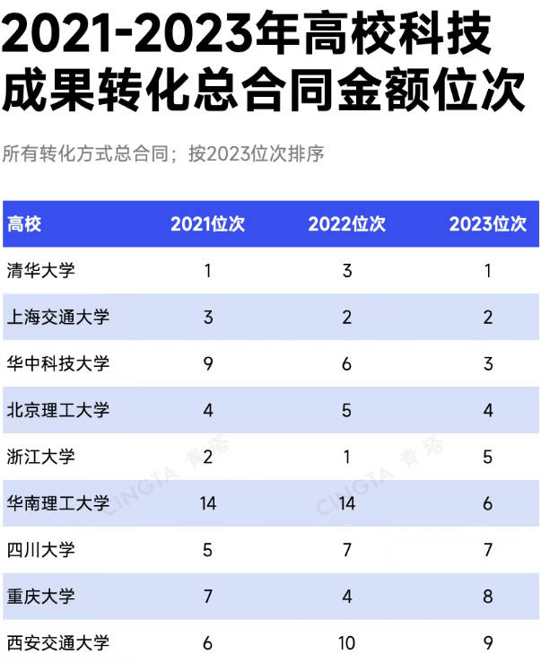 根据历年《中国科技成果转化年度报告》数据,四川大学在2021-2023年高校科技成果转化总合同金额排行榜中,一直稳居前10,2023年位列全国第7。由此可见四川大学在这方面的“搞钱能力”具备一定实力。