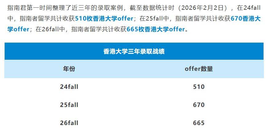 指南君第一时间整理了近三年的录取案例,截至数据统计时(2026年2月2日),在24fall中,指南者留学共计收获510枚香港大学offer;在25fall中,指南者留学共计收获670香港大学offer;在26fall中,指南者留学共计收获665枚香港大学offer。