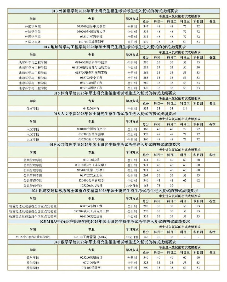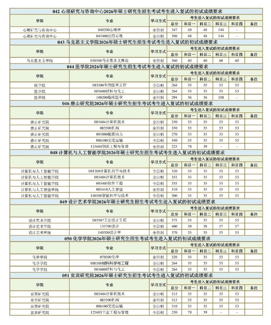 根据教育部文件精神,结合我校实际情况,经学校研究生招生委员会审定,并报四川省教育考试院审核备案, 现将学校2026年硕士研究生招生考试考生进入复试的初试成绩要求公布如下: