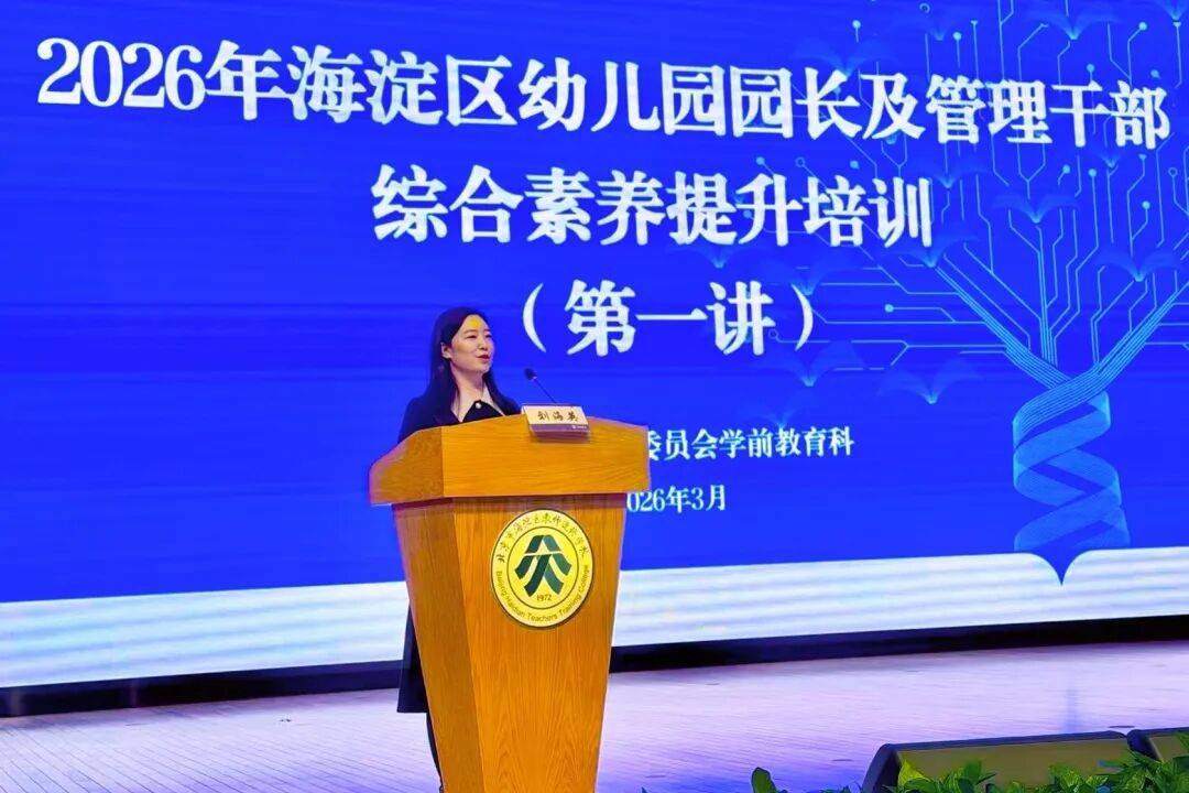 3月18日下午,由海淀区教委学前科举办的“2026年海淀区幼儿园园长及管理干部综合素养提升培训”第一讲在海淀区教师进修学校开课。全区近500名园长及管理干部齐聚一堂,聚焦“托幼一体化”这一民生热点,开启年度专业成长第一课。海淀区学前科科长刘海英主持培训。