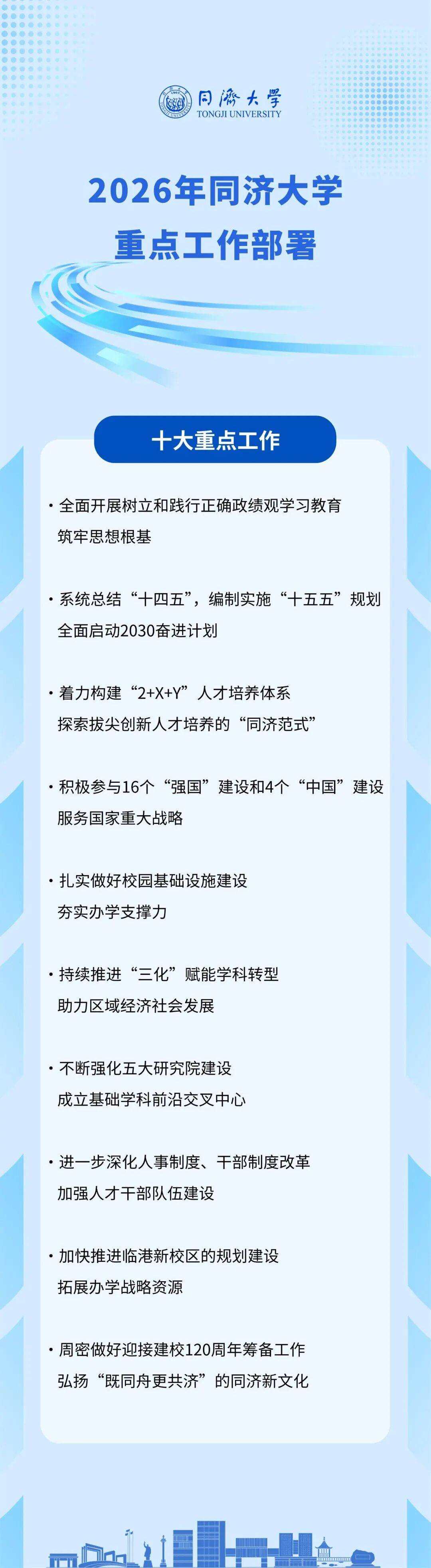 杨金龙指出,对接国家战略、服务地方经济、推动人类进步,是现代化大学的核心使命与价值导向。国家战略所指,就是同济奋斗所向。江河奔涌,唯奋楫者先;风浪激荡,唯同心者胜。2026年,学校将继续聚焦“强国建设,同济有为”,进一步深化教育综合改革,坚持以一流党建引领一流大学建设,持续深耕学科交叉融合和工程智能赋能,强化有组织科研和有组织培养拔尖创新人才,在中德中欧教育科技人文交流和国家开放合作中展现更大作为,确保“十五五”开好局、起好步,以实干实绩迎接建校120周年,奋力谱写中国特色世界一流大学建设的崭新篇章。