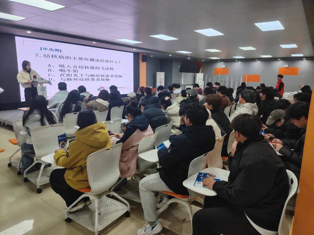 本次活动紧扣校园防控重点,采用知识讲座+知识竞赛相结合的形式,面向在校学生进行系统化、互动式宣传。活动伊始,疾控中心工作人员围绕结核病基础知识开展专题讲座,重点讲解了结核病的致病原因、传播途径、主要临床症状、易感人群、早期识别方法、规范诊疗流程等内容。同时结合高校人员密集、学习生活相对集中的特点,针对性讲解了教室、宿舍日常通风、个人卫生防护、可疑症状及时报告、密切接触者筛查等校园防控要点,引导学生树立“早发现、早诊断、早治疗”的健康意识。