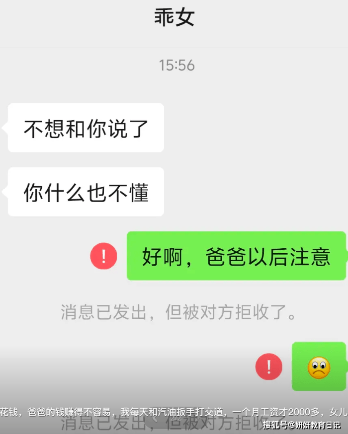 这位父亲事后意识到自己的错误,但是想要挽回关系的消息发出去之后,却出现了两个刺眼的红色感叹号,他才明白自己的女儿已经不愿意理自己了。