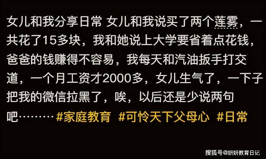 每天都得和汽油扳手打交道,一个月工资才2000多。听完这些话之后,这个女儿也生气了,一下子就把父亲的好友拉黑,留下的最后两句话是不想和你说了,你什么也不懂。
