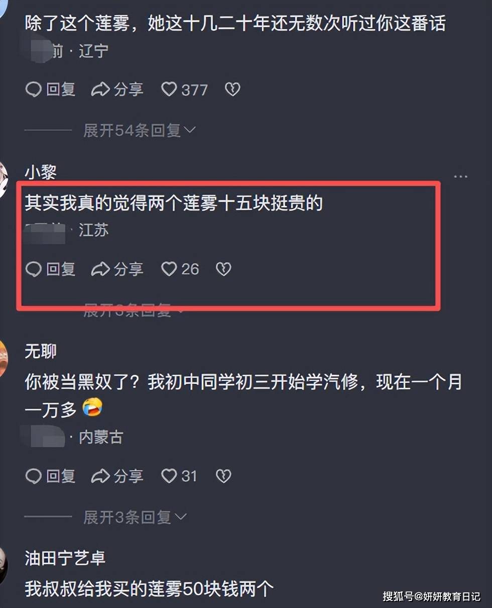让快乐变成了一件很奢侈的事。本来15块钱确实不算大钱,但在家长眼里,明明可以花在更实在的地方,比如大学生吃一顿饭填饱肚子,而不是买两个小水果。