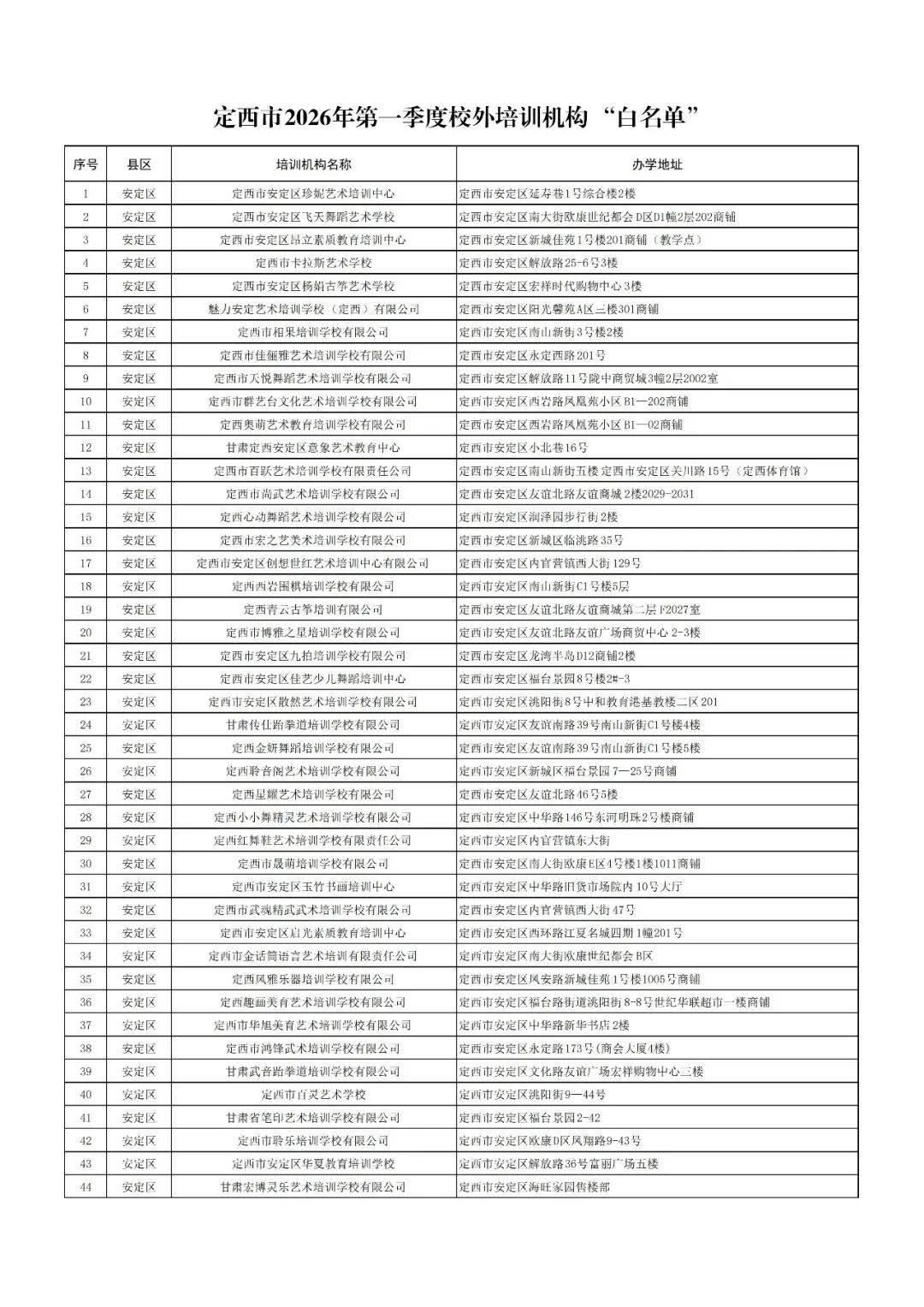 为持续巩固校外培训治理成效,进一步强化校外培训机构监督管理,切实维护广大学生家长的合法权益,全力营造安全、规范、有序、健康的校外培训良好环境,现将全市298家证照齐全、运营规范的校外培训机构“白名单”及联合公安、市场监管、民政、消防救援等部门查处的42家无证无照、违规运营的校外培训机构“黑名单”予以公布(截至2026年3月20日)。请广大学生家长理性看待校外培训,合理选择培训机构,共同抵制违规培训。同时,欢迎社会各界对违法违规校外培训的监督和举报。