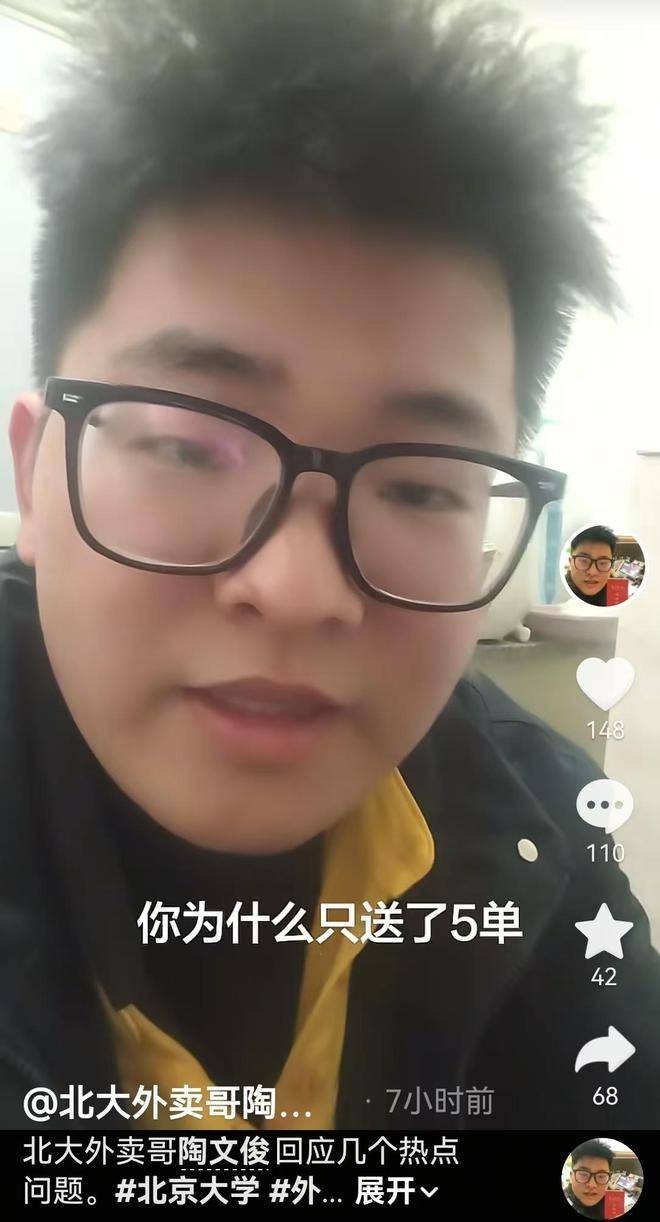 针对网友最在意的“只送5单算不算外卖员”“是不是刻意炒作”的问题,陶文俊也给出了直白回应,他表示美团平台确实只跑了5单,但平时也会接校园外卖和其他零散跑腿单,只是没有刻意对外细说,当初发视频只是随手记录日常,根本没想过靠北大标签博流量,更没有想过抹黑母校。