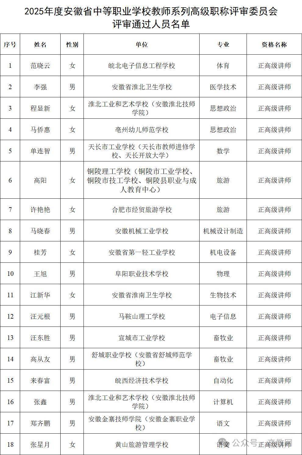 日前,安徽省教育厅发布了《2025年省中小学教师系列、中等职业学校教师系列高级职称评审通过人员公示》信息。