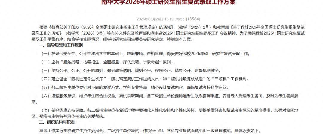 南华大学终于发布了《南华大学2026年硕士研究生招生复试录取工作方案》,一起来看看!