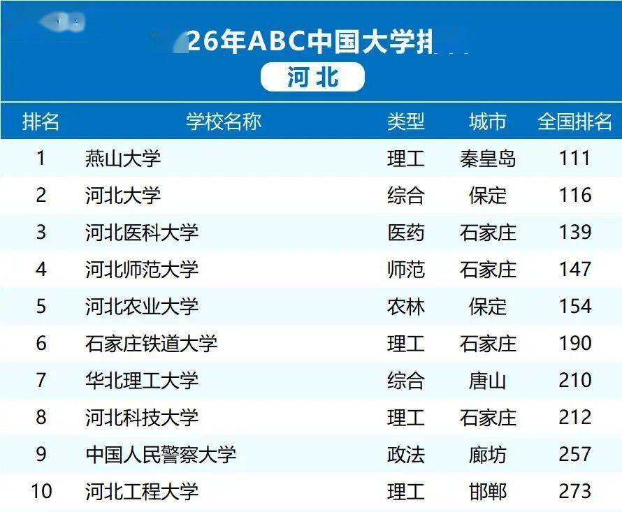 近日,2026年ABC中国大学排名揭晓,河北省十强高校名单正式出炉,展现了区域高等教育的蓬勃活力。燕山大学以全国第111名的成绩继续领跑,稳居河北榜首。河北大学位列第116名,综合实力突出;河北医科大学排名第139,医药领域备受认可;河北师范大学居第147名,师范特色鲜明。其他高校如河北农业大学、石家庄铁道大学等也成功入围,共同勾勒出河北高校的多元发展图景。