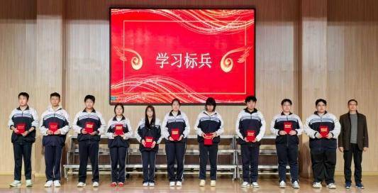 高三级部副主任孙程程宣读一模考试表彰决定,对在本次考试中涌现出的优秀学子进行表彰。本次表彰设置了“学习标兵”“进步之星”“学科状元”等多个奖项。在热烈的掌声中,获奖同学依次上台领奖,学校领导为他们颁发荣誉证书并合影留念。
