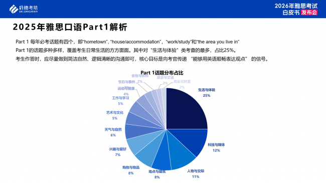 2026年3月21日,启德考培在北京发布《2026雅思考试白皮书》。报告分析:2025年雅思听力考试,命题思路整体稳定,在题型分布和场景设置存在一定的结构特征。雅思口语老题返场、旧题改编、全新题占比少。启德考培预测,2026年雅思听力场景方面不会有大的变化。口语考查的重点仍然不会在专业知识,而但也要避免泛泛而谈。