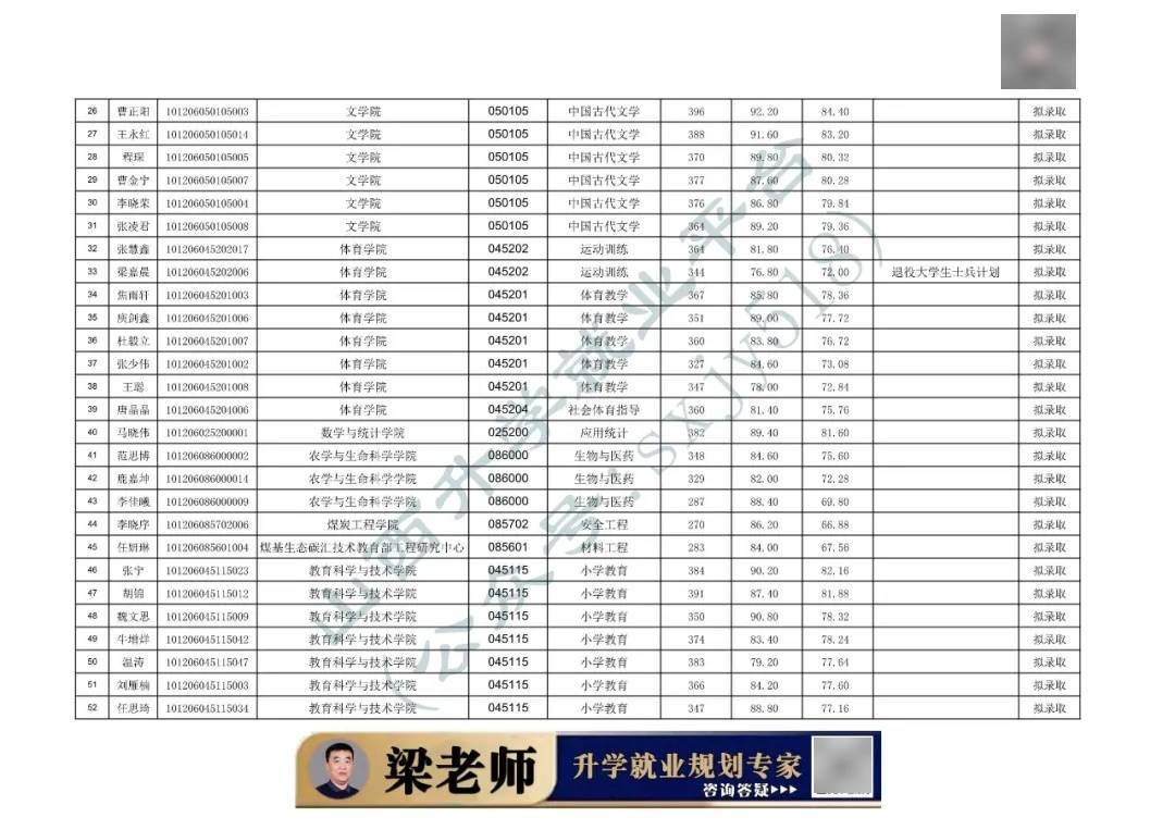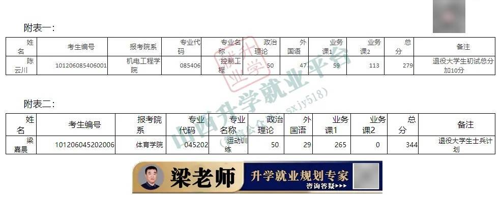 根据上述文件精神,按照我校“退役大学生士兵计划”初试总成绩可低于2026年全国初试成绩基本要求规定的A类考生复试总分分数线50分,单科成绩可低于2026年全国初试成绩基本要求规定的A类考生复试单科分数线10分的要求,对符合条件的考生名单进行公示,名单见附表二。