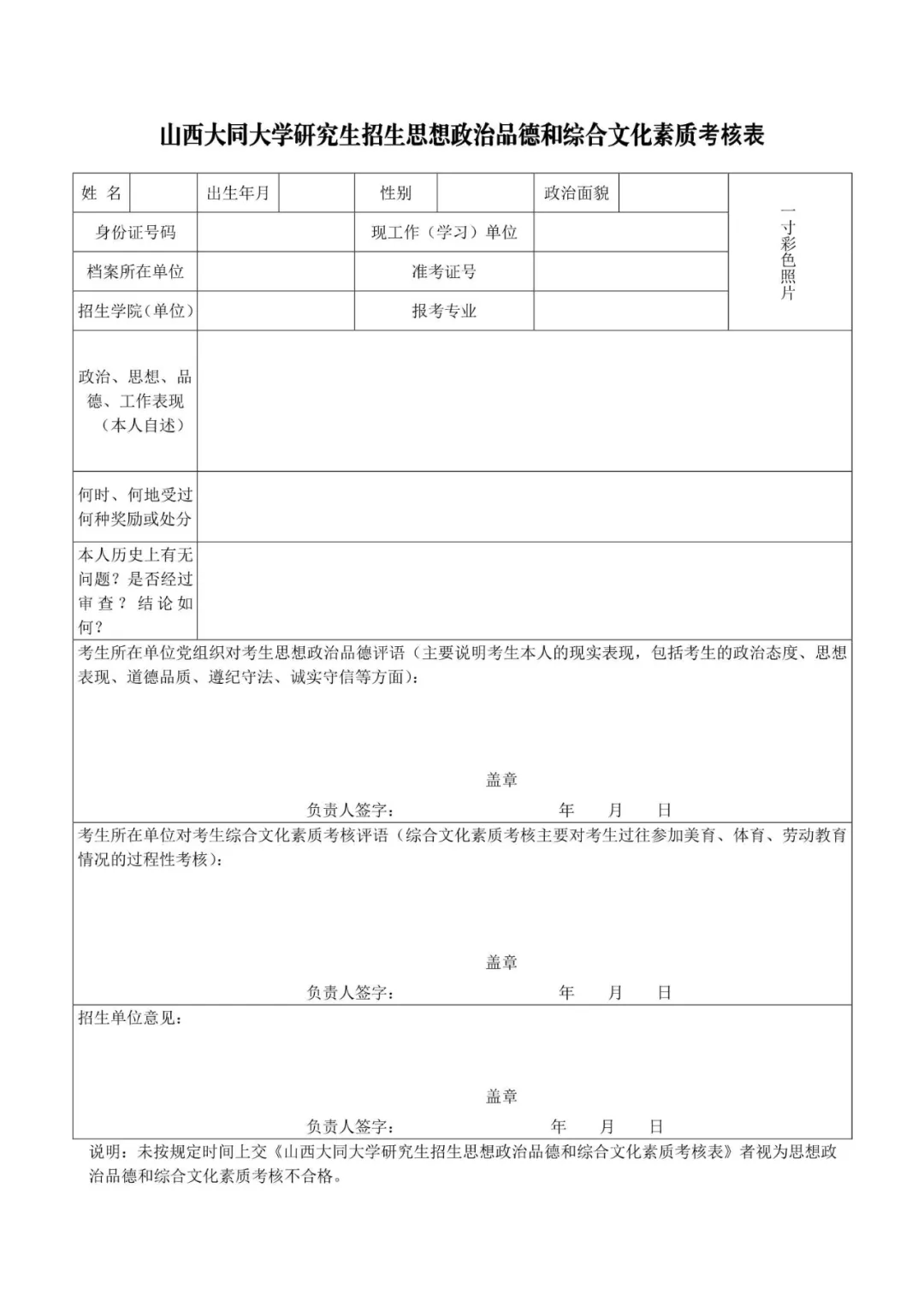 5.《山西大同大学研究生招生思想政治品德和综合文化素质考核表》(加盖公章)(附件2)。