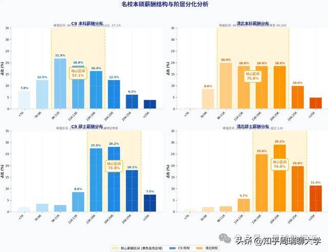 这种分布差异背后,是学历与名校的双重溢价逻辑:本科阶段,名校的作用更多是 “兜底” 与 “抬升中位数”,清北与 C9 的核心区间占比相近,但清北的区间更靠右;硕士阶段,学历本身就完成了一次 “筛选”,将低收入群体进一步压缩,而清北的名校身份则在硕士阶段进一步放大了高薪优势,让更多人进入 16K-25K 的核心高薪区间。换句话说,本科看 “学校保底”,硕士看 “学历抬升 + 名校加码”,两者共同塑造了顶尖高校毕业生的薪酬阶层。