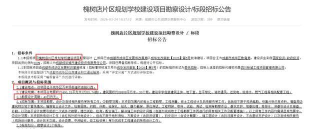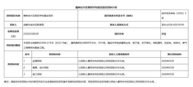 2026年2月2日,成都市公共资源交易服务中心发布“槐树店片区规划学校建设项目招标计划”。