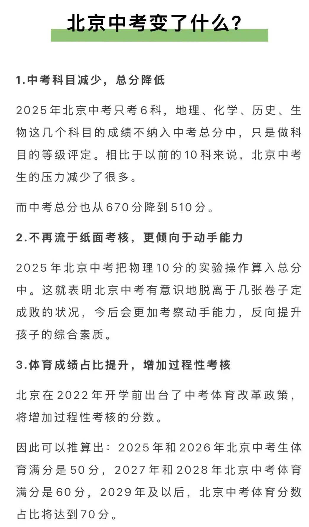 北京早在2025年就已落地改革,将历史、地理、化学、生物这四门学科全改为等级考查,不再计入中考总分。