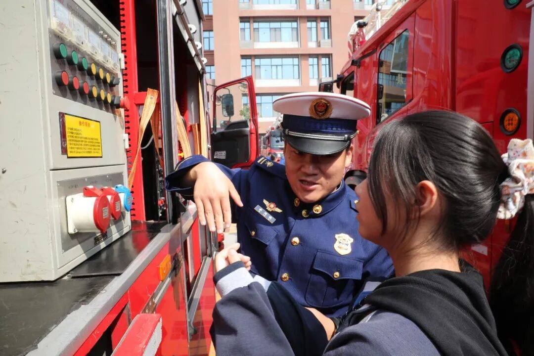 器材展示区同样吸睛无数,各类高精尖消防救援装备整齐陈列,消防员耐心细致地为同学们讲解每一件装备的性能、用途和操作方法,让孩子们零距离接触消防科技、感受消防力量。其中,消防战斗服穿戴体验最受追捧,同学们争先恐后穿上厚重的消防防护服、戴上头盔,瞬间变身“小小消防员”,真切体会到消防员执勤备战的艰辛与责任。