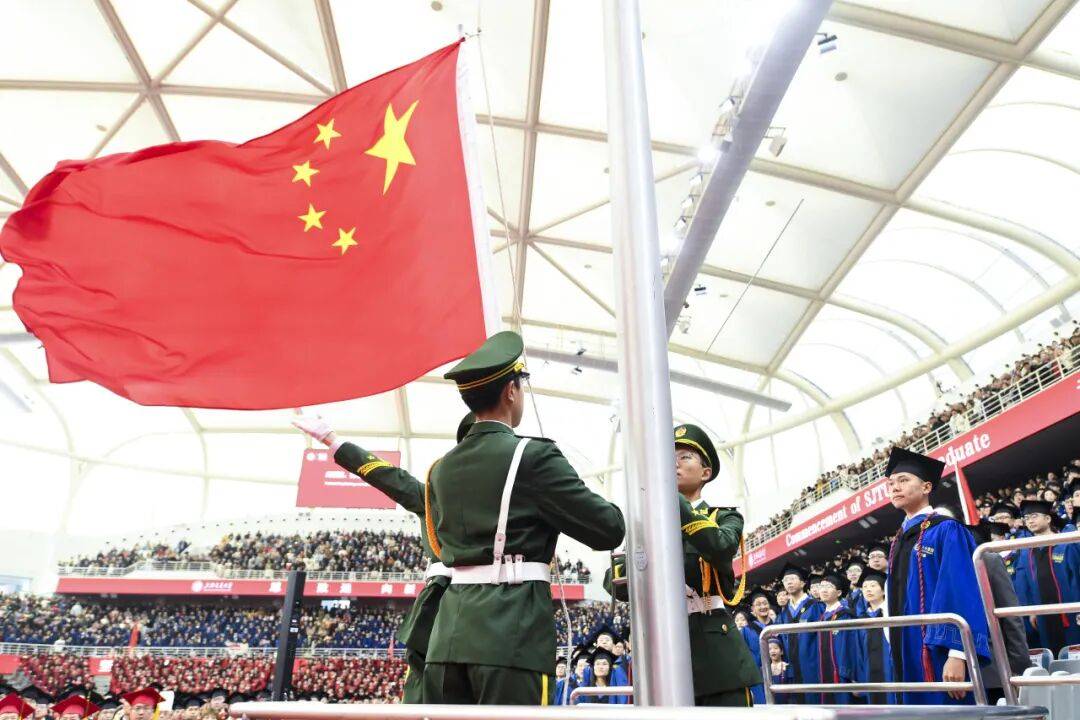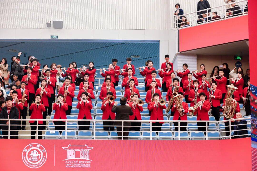上海交通大学学生军乐团奏响雄壮的《义勇军进行曲》,全场齐声高唱中华人民共和国国歌。