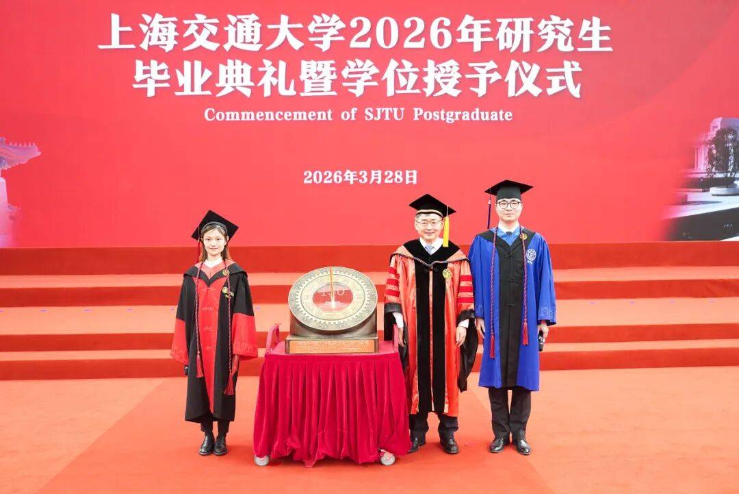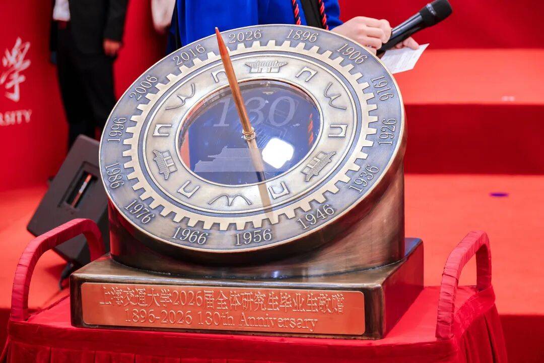 为更好联系和服务广大校友,学校校友会自2010年开始开展班级理事的聘任工作。今年,217名有热情、有责任心的研究生毕业生获聘班级理事,将成为班级校友之间、校友与院系之间以及校友与母校之间的桥梁和纽带。毕业典礼上,一份由毕业生设计制作,饱含2026届毕业生对母校深情的礼物《百卅同心·时间之环》由研究生校友班级理事代表赠予交大。作品以交大徐汇校区日晷为灵感源泉,以时间之环和历史年轮为形。外环铭刻1896至2026的重要时间节点,勾勒出交大130年的奋进征程;内环融入校园地标线稿,凝练一代代交大人共同的青春记忆。这份礼物既是2026届毕业生献给母校的一份深情贺礼,也寄托着交大学子对母校再谱华章的美好祝愿。学校则赠予全体博士毕业生博士学位服披肩,赠送优博论文作者、优秀毕业生们荣誉锦章,赠予全体毕业生学位帽流苏和喜饼,祝福各位毕业生鹏程万里、前程似锦。