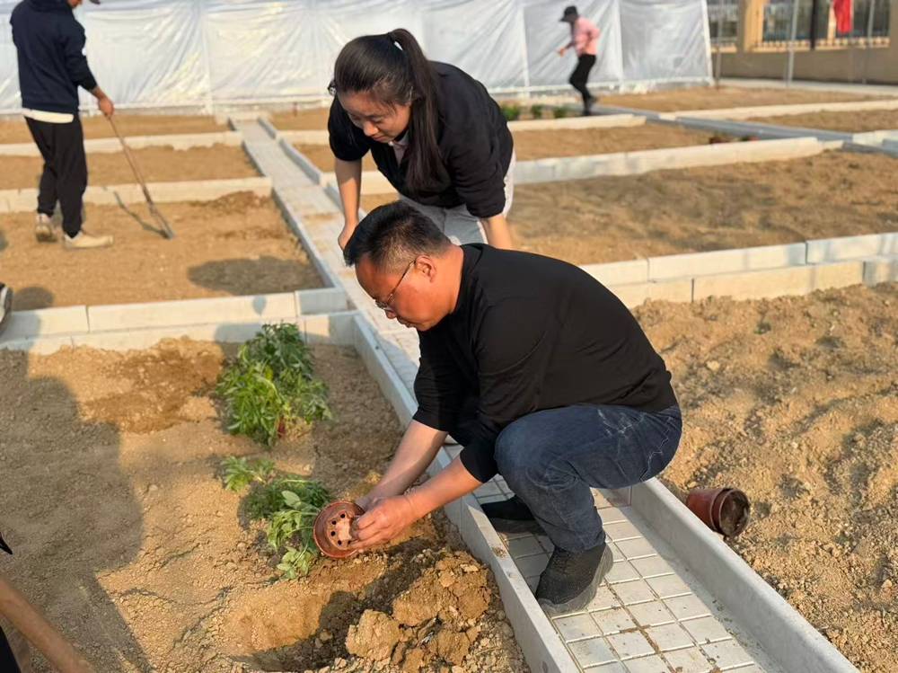 主持人宣布正式开种后,各位来宾与师生、家长合影留念,共同定格这一美好瞬间。随后,耕种实践正式开启,校园内呈现出一派热火朝天的劳动景象。