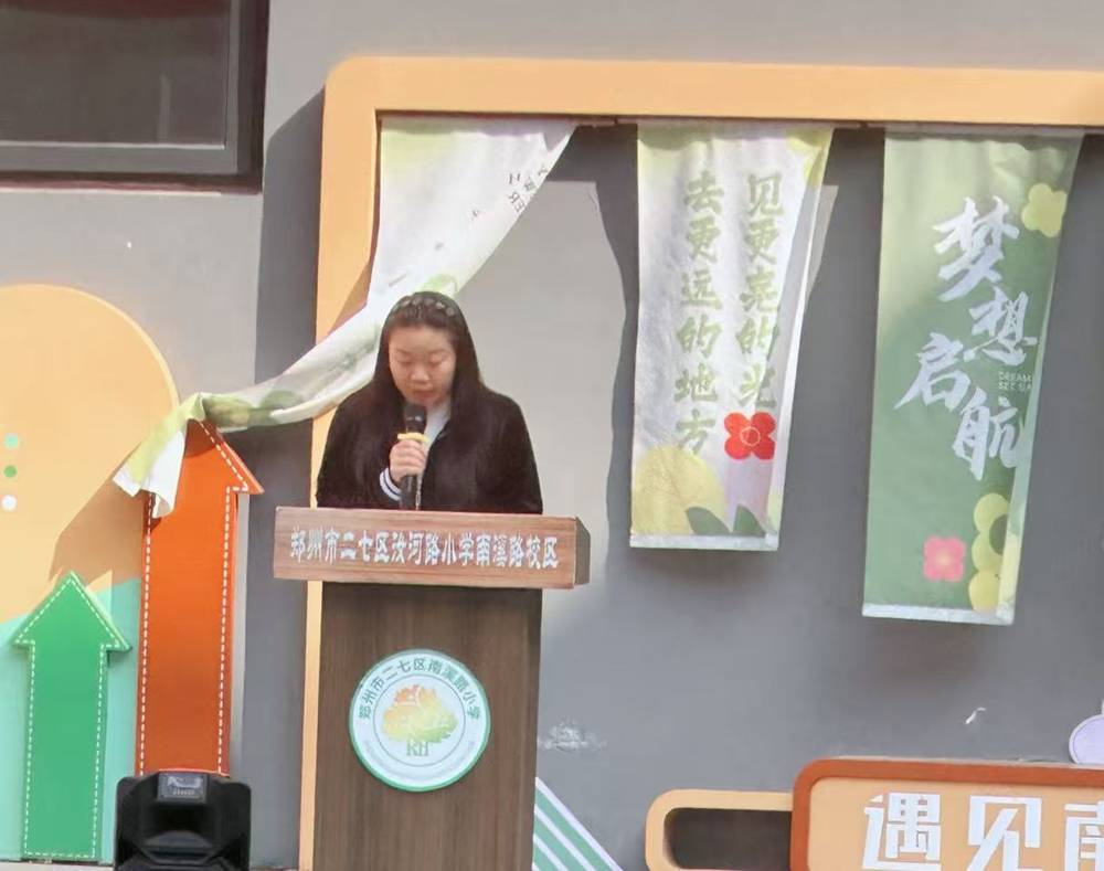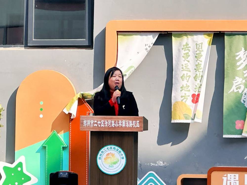 二七区教育发展研究中心教学研究室主任石明晶发表讲话,高度肯定学校耕读教育的创新举措,认为这是落实“五育并举”的生动实践。随后,石主任正式宣布春耕节开幕,现场掌声经久不息。