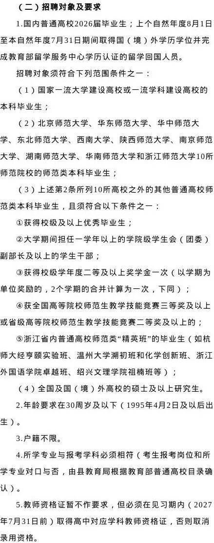 5.资格初审:招聘学校负责资格初审,县教育局负责资格初审的指导和监督。通过资格初审人数不足招聘计划人数3倍的职位,相应核减或取消该职位招聘计划人数。招聘计划的调整情况将在浙江省通用招聘网报平台(http://qssy.zjks.com)上公布。