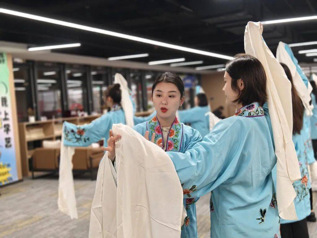 雄安新区青年夜校开班,报名京剧表演课的年轻人跟着专业京剧教师(右二)练习基本功。中国宋庆龄青少年科技文化交流中心供图