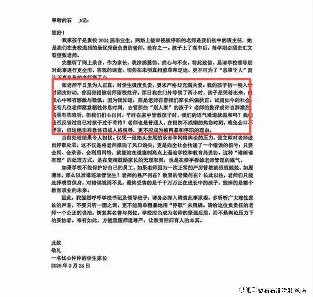 一大批在校家长、往届学生家长,联名写下了一封为张老师正名的长信。他们口中的张老师,是孩子求学路上遇到过最优秀、最负责的好老师。