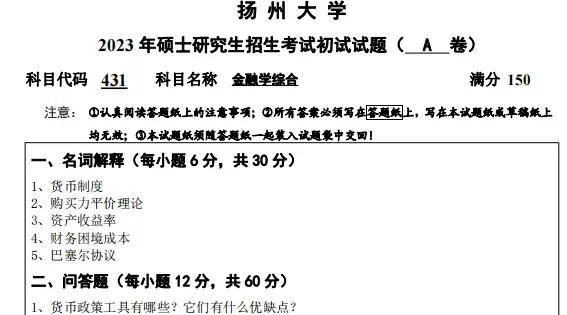 2023年扬州大学431金融学综合考研真题参考答案