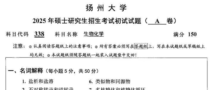 26年开始扬大生物学071000)、生态学(071300)、生物与医药硕士(生物技术与工程)(086001)专业的第三门考试科目由原来的634生物化学(自)➡️“338生物化学”。