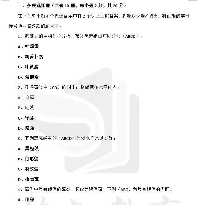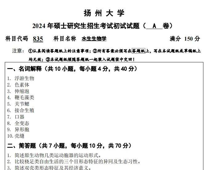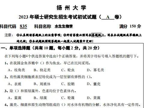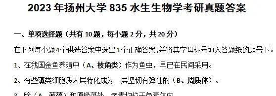 2020-2023年扬州大学835水生生物学考研真题参考答案【答案到23】