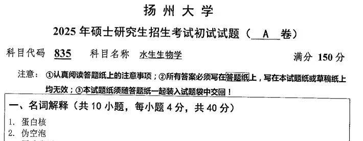 2020-2025年扬州大学835水生生物学考研真题试卷