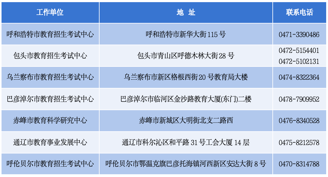 本次面试设置呼和浩特市、包头市、乌兰察布市、巴彦淖尔市、赤峰市、通辽市和呼伦贝尔市7个考区,考生就近选择考区。具体面试考点以准考证公布信息为准。以下科目只在呼和浩特市和通辽市设考区:小学学段的心理健康教育、信息技术、小学全科、特殊教育;初中、高中、中职各学段的心理健康教育、日语、俄语、特殊教育;中职专业课和实习指导课。