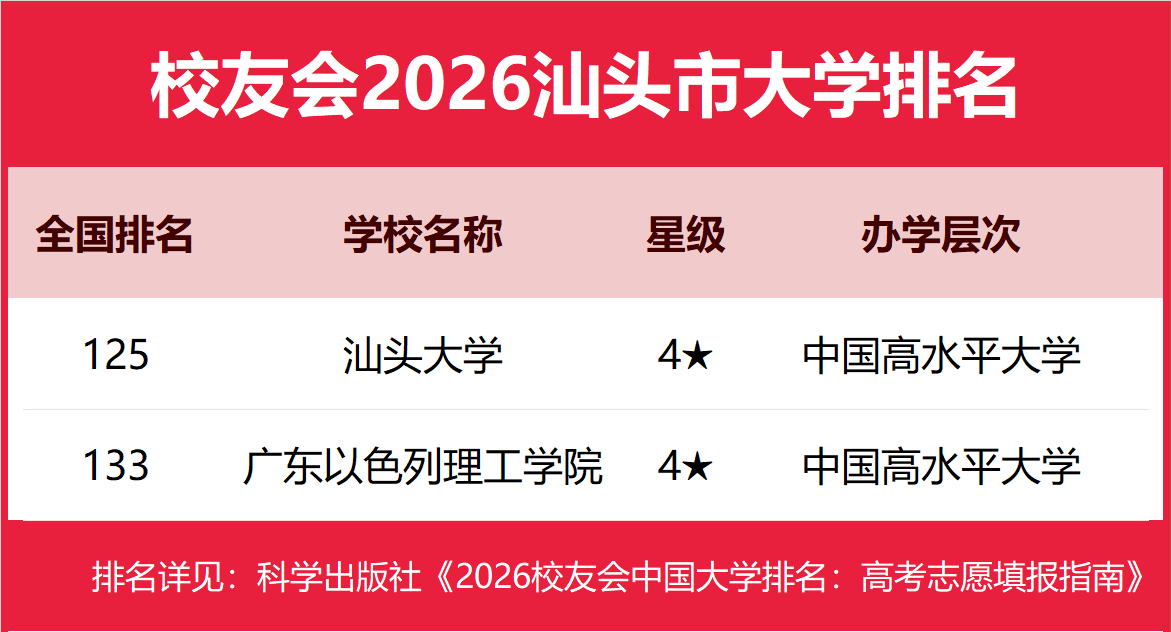 校友会2026汕头市大学排名,汕头大学第一,广东以色列理工学院前三