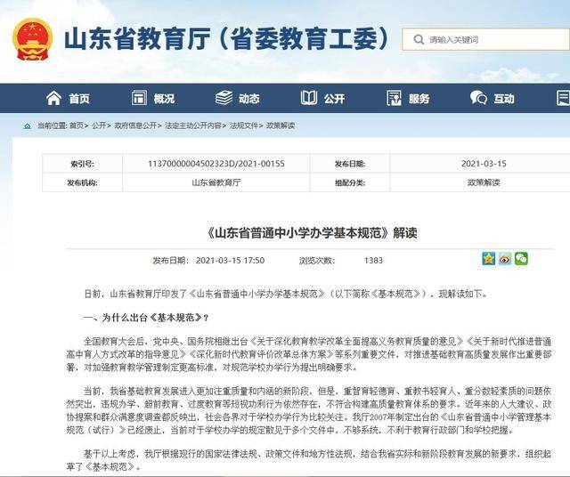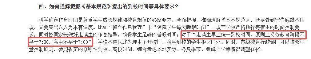 都市现场记者从山东省教育厅官网查询到,2021年3月15日发布的《山东省普通中小学办学基本规范》解读中,明确了到校时间等具体要求。 科学确定作息时间是尊重学生成长规律和教育规律的必然要求。全面把握、准确理解《基本规范》,既要做到守住底线不违规,又要突出以人为本有温度。比如“健全作息管理”中“保障学生每天睡眠时间”,规定学校严格执行寄宿生的时间控制要求,同时协同家长做好走读生的作息指导,确保学生足够的睡眠时间;对于“走读生早上统一到校时间,原则上义务教育阶段不早于7:30,高中不早于7:00”,学校不得以此为理由不开校门,将早到校的学生拒之门外。同时,市级教育行政部门可以按照总量控制原则,参照省定的原则性到校、离校时间,综合考虑本地实际、冬夏季节、错峰上学等情况调整优化。