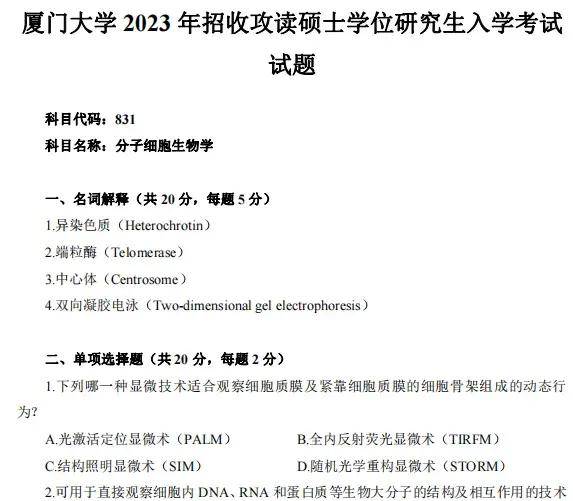 1997-2026年厦门大学831分子细胞生物学考研真题试卷