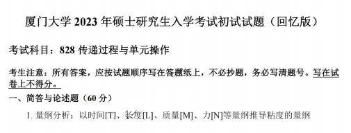 2004、2005、2007,2010-2023年厦门大学828传递过程与单元操作考研真题试卷【近年为回忆版】