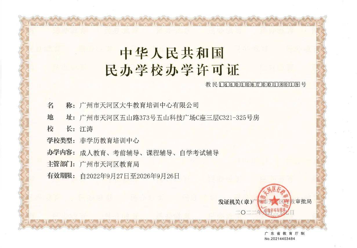 1. 资质最硬,官方背书可靠:大牛教育不仅是广外的官方助学点,更是经广州市招生考试委员会办公室连续多年备案公示的正规社会助学机构。其持有教育局颁发的《民办学校办学许可证》,办学资质齐全透明,让学员报名无忧。