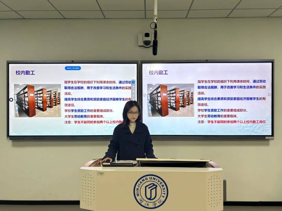 钟嘉欣围绕工作中应有怎样的态度、工作中要注意什么以及如何在工作中提升自己三个方面开展勤工工作素养培训。她结合视频案例,对工作素养的具体内容和要求进行了讲解。讲解过程中,钟嘉欣通过提问的方式与同学们互动,同时结合培训内容开展岗位知识问答及案例分析,提升了新岗同学对岗位工作的熟悉程度。最后钟嘉欣向同学们详细介绍了图书馆“勤学堂”劳动教育课程,她鼓励同学们积极参加“勤学堂”劳动教育课程,在工作实践中不断提高和充实自己。