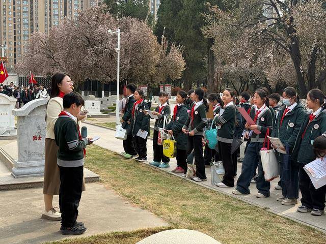 高年级立足研学强志,推动思政教育从课堂走向实践。五年级走进烈士陵园开展红色研学,在红领巾讲解员引导下,聆听革命事迹、铭记历史细节,厚植家国担当;六年级举办 “清明寄哀思,和平守初心” 主题演讲比赛,学生结合英烈精神与时代使命抒发志向,坚定理想信念。