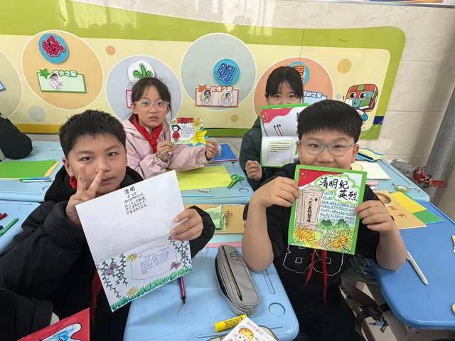 中年级聚焦实践育情,以诵读与制作为载体。三年级举办清明诗词诵读会,学生诵读传统名篇与红色诗篇,在韵律中感悟追思与爱国情怀;四年级开展 “致敬英烈,感恩前行” 感恩卡制作,一句句真挚寄语,承载对英烈的崇高敬意。